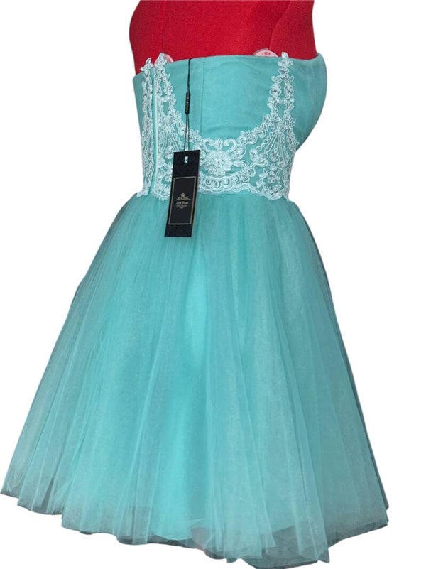 Vestido de tul turquesa corto, brodado con piedras Swarovski. Es único