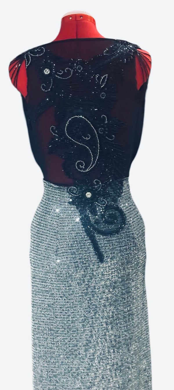 El vestido Erica tiene toda la espalda hecha con broderia de cristale hecha a mano sobre tul transparente, la falda recta de letenjuelas con apertura delantera profunda en la pierna, con un escote V profundo. Talla S