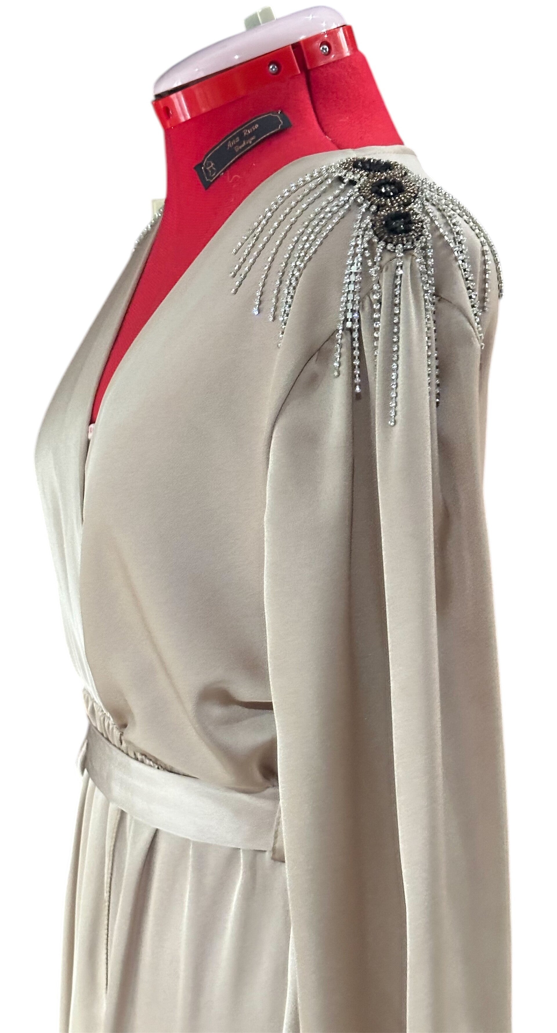 Este elegante vestido de seda largo con manga larga y con sus accesorios en los hombros que están hechos a mano. Con apertura delantera en la falda. Especial para ponértelo en cualquier ocasión. Único. Talla S/M