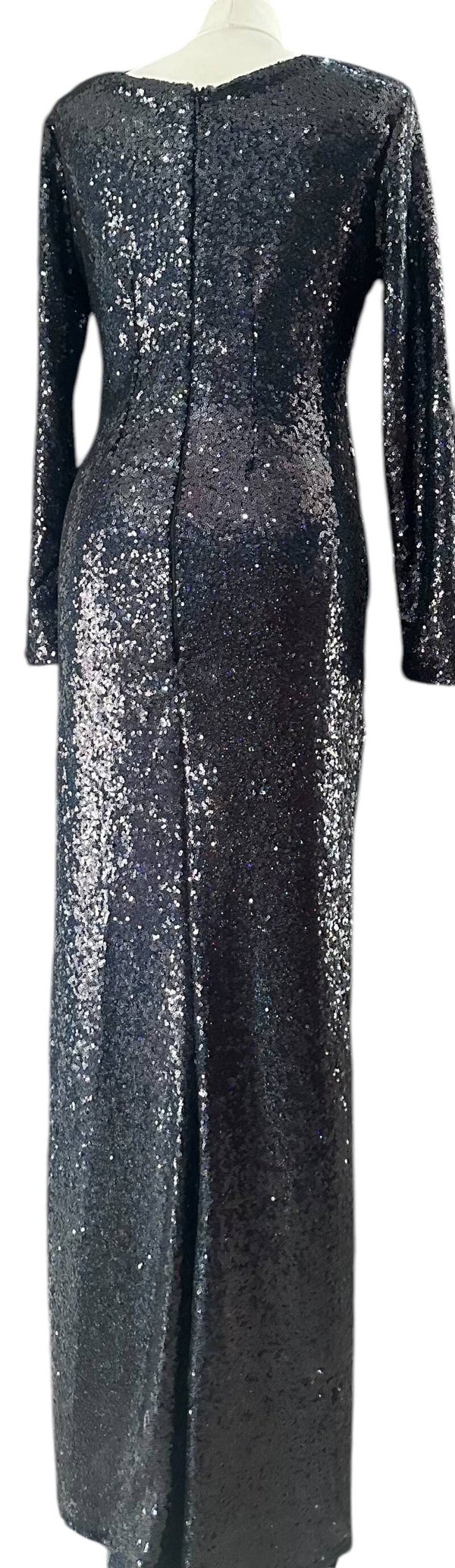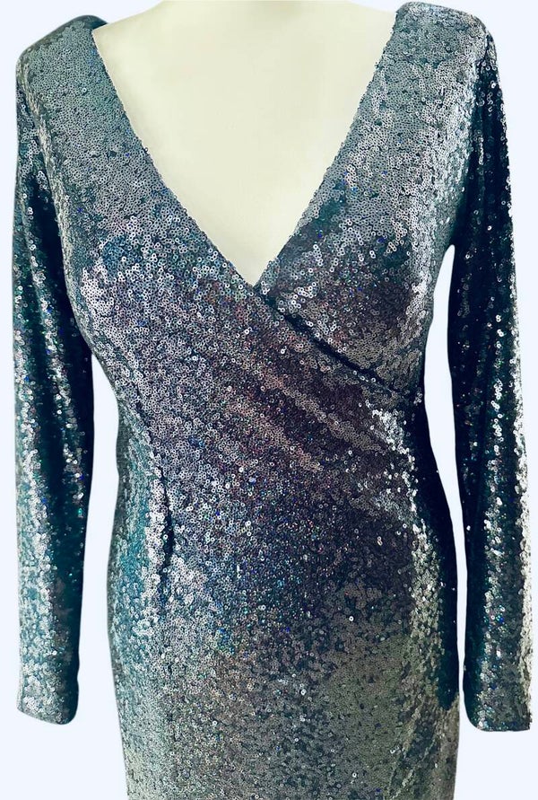 Vestido de letenjuelas negro, multicolor con mangas largas y escote V profundo. Talla M