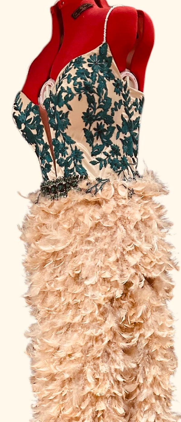 Vestido largo con apertura abierta en la pierna, de plumas naturales, el corset bordado y cosido a mano. Con piedras de cristal. Es único y está disponible en Talla M