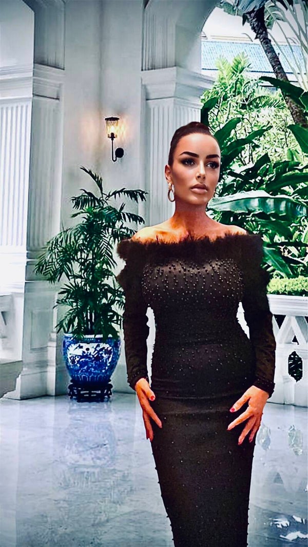 Este precioso vestido tubo con apertura abierta trasera de mangas largas con plumas naturales y perlas negras. Es único y está disponible en talla S